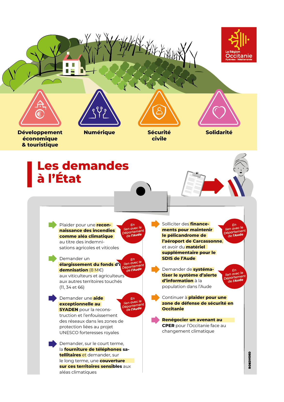 Ce visuel résume avec efficacité les priorités régionales et les actions d’urgence liées aux incendies des Corbières en 2025, mettant en avant le soutien aux acteurs locaux et la mobilisation des dispositifs adaptés.