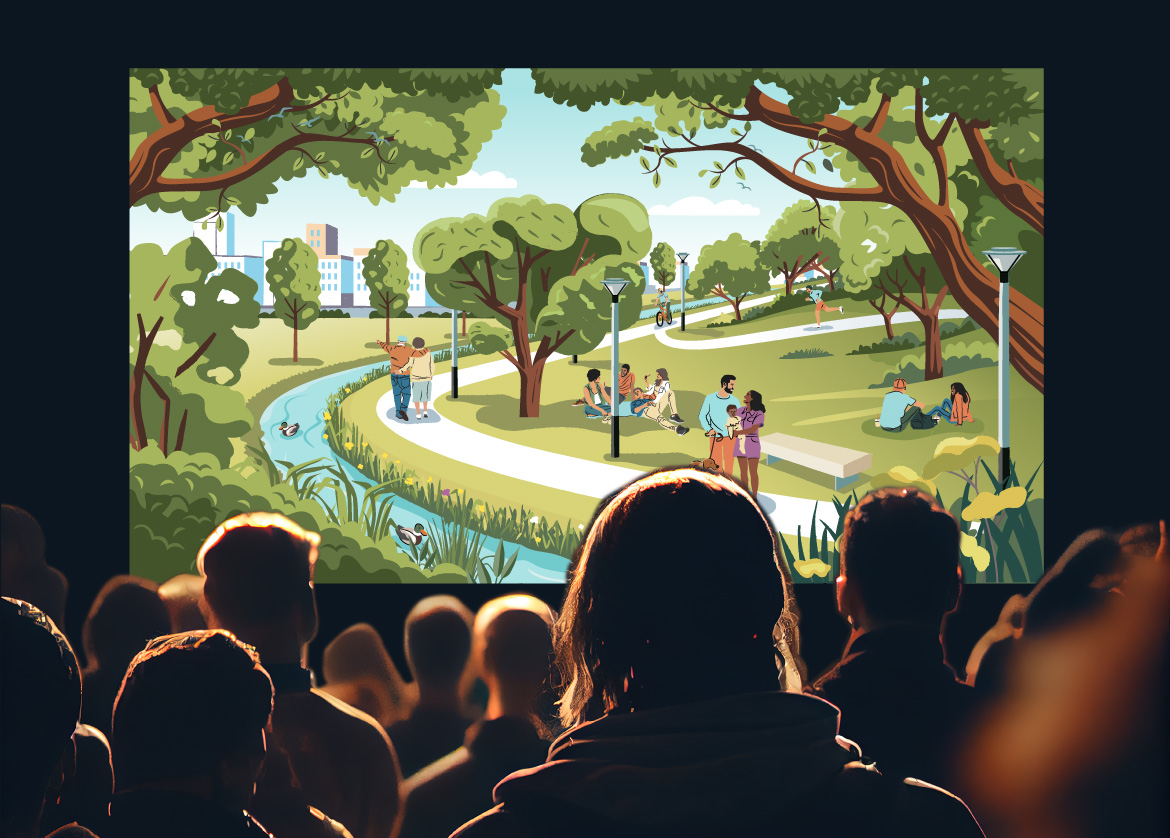 Dans le cadre d’une exposition organisée par la ville de Gentilly intitulée "Imaginons la ville", nous avons réalisé une illustration accompagnant une boucle sonore qui imagine comment pourraient évoluer les abords de la Bièvre si le projet de réouverture et de renaturation était mené à bien. Ce travail propose une vision nouvelle du paysage urbain, où la rivière retrouve sa place à ciel ouvert et où une biodiversité renouvelée s’exprime, avec les chants des grenouilles, oiseaux et autres espèces réinvestissant les lieux. L’œuvre invite à une expérience immersive mêlant image et son pour ressentir la nature revenant au cœur de la ville et transformer l’espace urbain en un sanctuaire vivant.