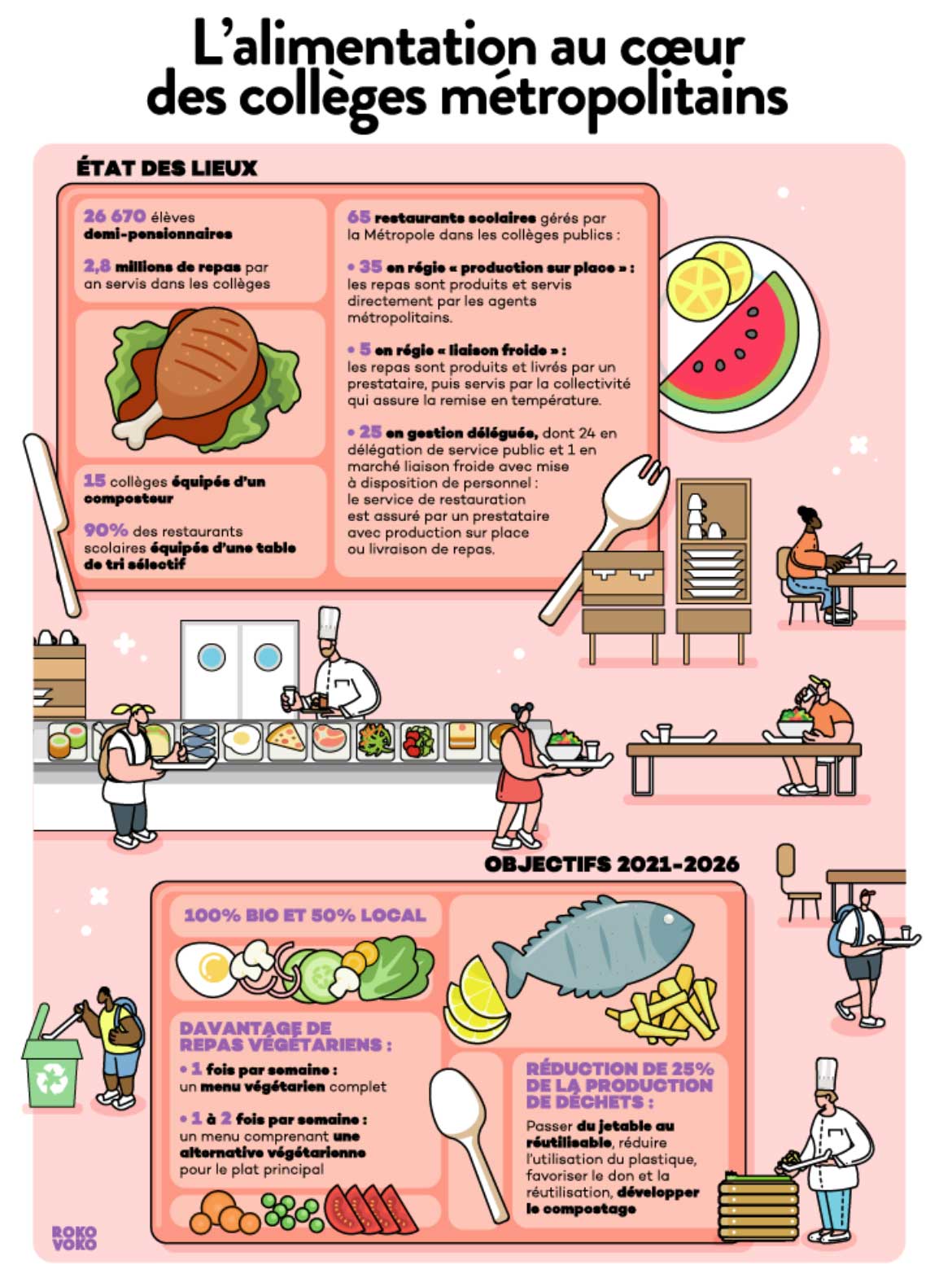 Colorée, structurée et dynamique, cette infographie traduit avec clarté l’engagement fort de la Métropole pour une restauration scolaire durable, saine et accessible, facilitant la compréhension des enjeux pour tous les publics.