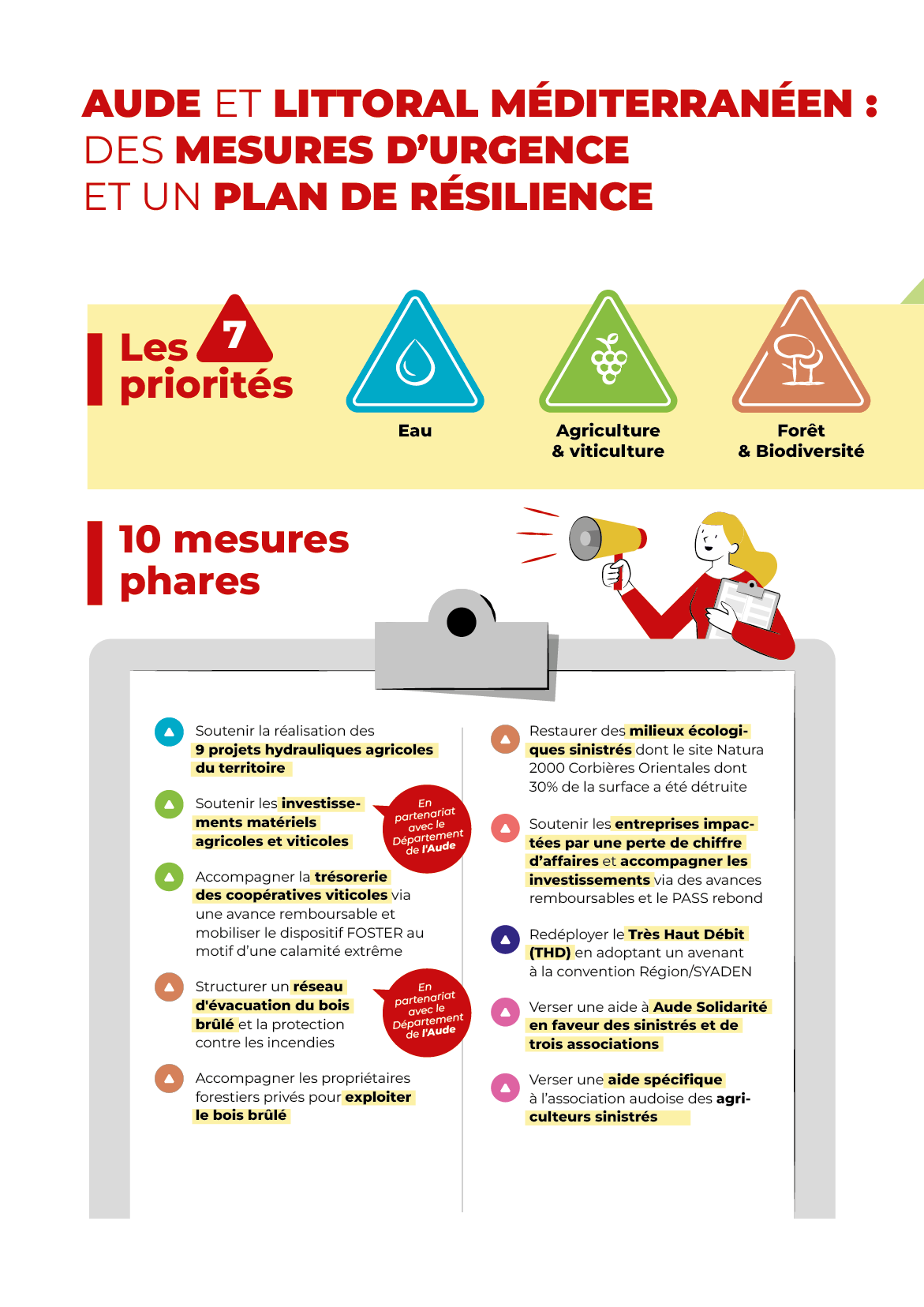 L’infographie double page commandée par la Région Occitanie met en lumière, de manière limpide et didactique, les réponses concrètes apportées suite aux catastrophes qui ont frappé cet été l’Aude et le littoral.